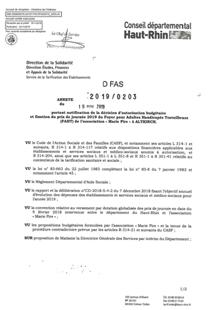 portant notification de la décision d'autorisation budgétaire et fixation du prix de journée 2019 du foyer pour adultes handicapés travailleurs (FAHT) de l'association "Marie Pire" à ALTKIRCH Resumé Pièces jointes ARRETE Assemblée : Non défini Date : 19/11/2019 Rapporteur : Non défini Collectivité : Conseil départemental du Haut-Rhin Direction : Non défini Service : Direction Ressources Solidarité Domaine : Prix de Journée Commission :