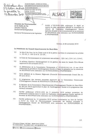 ordonnant le dépôt en mairie du plan parcellaire définitif et constatant la clôture de l'opération d'aménagement foncier agricole, forestier et environnemental de la commune de ROUFFACH avec extension sur GUNDOLSHEIM et PFAFFENHEIM Resumé Pièces jointes ARRETE Assemblée : Non défini Date : 22/11/2019 Rapporteur : Non défini Collectivité : Conseil départemental du Haut-Rhin Direction : Non défini Service : Direction de l'Environnement et du Cadre de Vie Domaine : Autres (non classés) Commission :