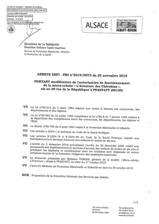 portant modification de l'autorisation de fonctionnement de la micro-crèche "L'Aventure des Chérubins", sis au 39 rue de la République à PFASTATT (68120) Resumé Pièces jointes ARRETE Assemblée : Non défini Date : 25/11/2019 Rapporteur : Non défini Collectivité : Conseil départemental du Haut-Rhin Direction : Non défini Service : Direction Enfance Famille Insertion Domaine : Accueil d'enfants Commission :