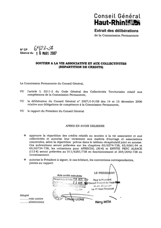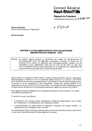 Le présent rapport propose la répartition des crédits de fonctionnement et d’investissement entre les différentes associations œuvrant en faveur de la protection de la nature, en conformité avec l’enveloppe globale « soutien à la vie associative et aux collectivités » fixée lors du vote du BP 2007 en date des 14 et 15 décembre 2006 et après soumission à la commission de l’agriculture de l’environnement et du cadre de vie réunie le 8 février 2007