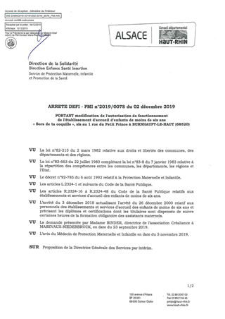 portant modification de l'autorisation de fonctionnement de l'établissement d'accueil d'enfants de moins de six ans "Sors de ta coquille", sis au 1 rue du Petit Prince à BURNHAUPT LE HAUT (68520) Resumé Pièces jointes ARRETE Assemblée : Non défini Date : 02/12/2019 Rapporteur : Non défini Collectivité : Conseil départemental du Haut-Rhin Direction : Non défini Service : Direction Enfance Famille Insertion Domaine : Accueil d'enfants Commission :