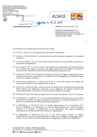 portant nomination d'un régisseur d'avances et de mandataires pour la régie n° 6 - MULHOUSE Ouest Resumé Pièces jointes ARRETE Assemblée : Non défini Date : 03/12/2019 Rapporteur : Non défini Collectivité : Conseil départemental du Haut-Rhin Direction : Non défini Service : Direction des Finances Domaine : Autres (non classés) Commission :