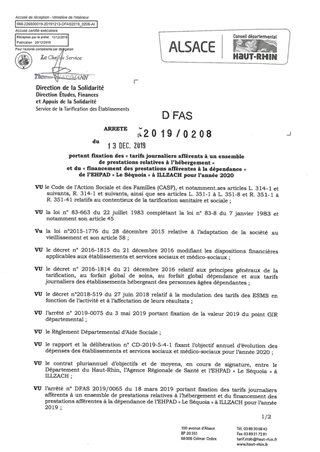 portant fixation "des tarifs journaliers afférents à un ensemble de prestations relatives à l'hébergement" et du "financement des prestations afférentes à la dépendance" de l'EHPAD "Le Séquoïa" à ILLZACH pour l'année 2020 Resumé Pièces jointes ARRETE Assemblée : Non défini Date : 13/12/2019 Rapporteur : Non défini Collectivité : Conseil départemental du Haut-Rhin Direction : Non défini Service : Direction Ressources Solidarité Domaine : Prix de Journée Commission :