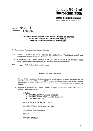 Contrats d'objectifs 2007 pour la mise en œuvre de la politique du logement social dans le Département du Haut-Rhin
