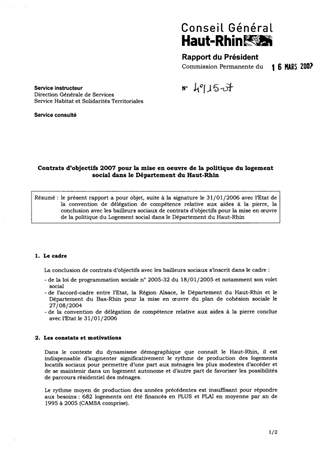 le présent rapport a pour objet, suite à la signature le 31/01/2006 avec l’Etat de la convention de délégation de compétence relative aux aides à la pierre, la conclusion avec les bailleurs sociaux de contrats d’objectifs pour la mise en œuvre de la politique du Logement social dans le Département du Haut-Rhin