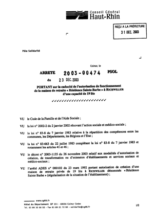 portant sur la caducité de l'autorisation de fonctionnement de la maison de retraite "Résidence Sainte Barbe" à RICHWILLER d'une capacité de 19 lits. Resumé Pièces jointes ARRETE Assemblée : Non défini Date : 23/12/2003 Rapporteur : Non défini Collectivité : Conseil départemental du Haut-Rhin Direction : Non défini Service : Direction de la Solidarité Domaine : Autres (non classés) Commission :