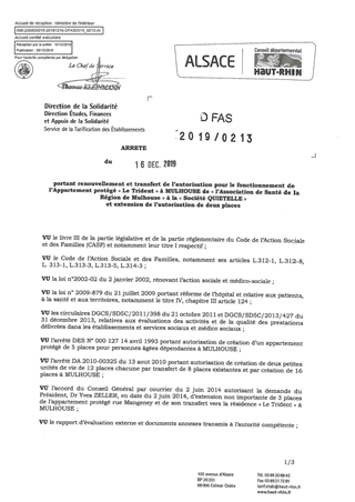 portant renouvellement et transfert de l'autorisation pour le fonctionnement de l'appartement protégé "Le Trident" à MULHOUSE de l'association de santé de la région de MULHOUSE à la "Société QUIETELLE" et extension de l'autorisation de deux places Resumé Pièces jointes ARRETE Assemblée : Non défini Date : 16/12/2019 Rapporteur : Non défini Collectivité : Conseil départemental du Haut-Rhin Direction : Non défini Service : Direction Ressources Solidarité Domaine : Autres (non classés) Commission :