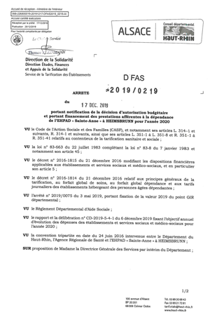 portant notification de la décision d'autorisation budgétaire et portant financement des prestations afférentes à la dépendance de l'EHPAD "Sainte-Anne" à HEIMSBRUNN pour l'année 2020 Resumé Pièces jointes ARRETE Assemblée : Non défini Date : 17/12/2019 Rapporteur : Non défini Collectivité : Conseil départemental du Haut-Rhin Direction : Non défini Service : Direction Ressources Solidarité Domaine : Dotations financières Commission :