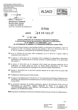 portant notification de la décision d'autorisation budgétaire et portant financement des prestations afférentes à la dépendance de l'EHPAD "Les Fontaines", sites de LUTTERBACH, de KEMBS et de HORBOURG-WIHR pour l'année 2020 Resumé Pièces jointes ARRETE Assemblée : Non défini Date : 17/12/2019 Rapporteur : Non défini Collectivité : Conseil départemental du Haut-Rhin Direction : Non défini Service : Direction Ressources Solidarité Domaine : Dotations financières Commission :