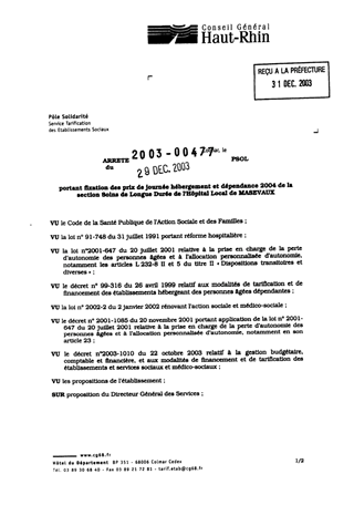 portant fixation des prix de journée hébergement et dépendance 2004 de la section de soins de longue durée de l'hôpital local de MASEVAUX. Resumé Pièces jointes ARRETE Assemblée : Non défini Date : 29/12/2003 Rapporteur : Non défini Collectivité : Conseil départemental du Haut-Rhin Direction : Non défini Service : Service de la Tarification des Etablissements Domaine : Prix de Journée Commission :