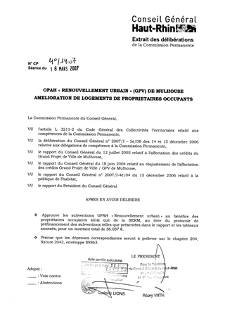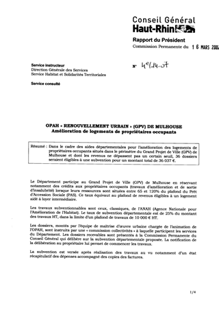 Dans le cadre des aides départementales pour l’amélioration des logements de propriétaires occupants situés dans le périmètre du Grand Projet de Ville (GPV) de Mulhouse et dont les revenus ne dépassent pas un certain seuil, 36 dossiers seraient éligibles à une subvention pour un montant total de 36 037 €.