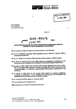 portant fixation des prix de journée hébergement et dépendance 2004 de l'EHPAD du centre hospitalier de ROUFFACH. Resumé Pièces jointes ARRETE Assemblée : Non défini Date : 29/12/2003 Rapporteur : Non défini Collectivité : Conseil départemental du Haut-Rhin Direction : Non défini Service : Service de la Tarification des Etablissements Domaine : Prix de Journée Commission :