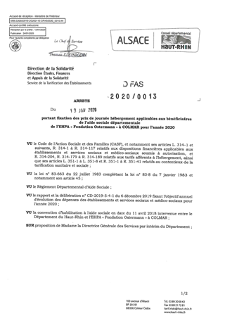 portant fixation des prix de journée hébergement applicables aux bénéficiaires de l'aide sociale départementale de d'EHPA "Fondation Ostermann" à COLMAR pour l'année 2020 Resumé Pièces jointes ARRETE Assemblée : Non défini Date : 13/01/2020 Rapporteur : Non défini Collectivité : Conseil départemental du Haut-Rhin Direction : Non défini Service : Direction Ressources Solidarité Domaine : Prix de Journée Commission :