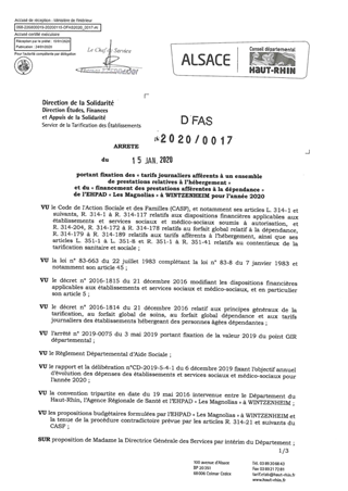 portant fixation des "tarifs journaliers afférents à un ensemble de prestations relatives à l'hébergement" et du "financement des prestations afférentes à la dépendance" de l'EHPAD "Les Magnolias" à WINTZENHEIM pour l'année 2020 Resumé Pièces jointes ARRETE Assemblée : Non défini Date : 15/01/2020 Rapporteur : Non défini Collectivité : Conseil départemental du Haut-Rhin Direction : Non défini Service : Direction Ressources Solidarité Domaine : Prix de Journée Commission :