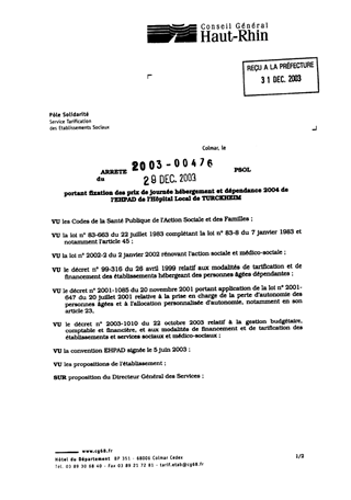portant fixation des prix de journée hébergement et dépendance 2004 de l'EHPAD de l'hôpital local de TURCKHEIM. Resumé Pièces jointes ARRETE Assemblée : Non défini Date : 29/12/2003 Rapporteur : Non défini Collectivité : Conseil départemental du Haut-Rhin Direction : Non défini Service : Service de la Tarification des Etablissements Domaine : Prix de Journée Commission :