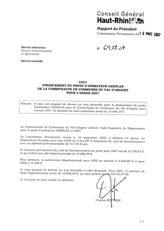Il vous est proposé de donner un avis favorable pour le financement du poste d'animateur GERPLAN pour la Communauté de Communes du Val d’Argent, pour l’année 2007. Le montant de notre subvention serait de 10.896,39 €.
