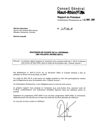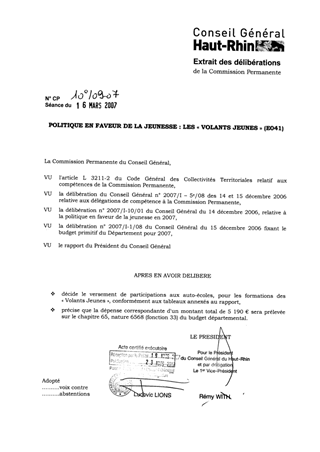Le présent rapport propose le versement d’un montant total de 5 190 € à diverses auto-écoles du Haut-Rhin, dans le cadre de la formation des « Volants Jeunes ».