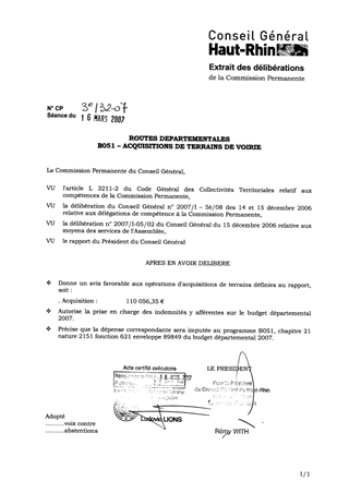 Le présent rapport a pour objet d'approuver les acquisitions de terrains liées aux opérations de la voirie départementale. Le montant de ces transactions immobilières s'établit comme suit : Acquisition : 110 056,35€.