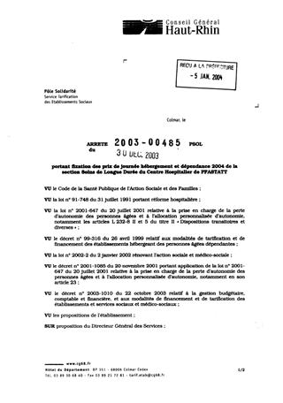 portant fixation des prix de journée hébergement et dépendance 2004 de la section soins de longue durée du centre hospitalier de PFASTATT. Resumé Pièces jointes ARRETE Assemblée : Non défini Date : 30/12/2003 Rapporteur : Non défini Collectivité : Conseil départemental du Haut-Rhin Direction : Non défini Service : Service de la Tarification des Etablissements Domaine : Prix de Journée Commission :