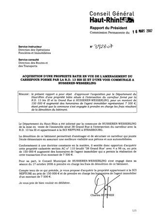 le présent rapport a pour objet d'approuver l'acquisition par le Département du Haut-Rhin d'une propriété bâtie située à l'intersection du carrefour formé par la R.D. 13 bis III et la Grand Rue à HUSSEREN-WESSERLING, pour un montant de 150 000 € augmenté des honoraires de l'agent immobilier représentant 7 500 €, étant précisé que la commune s'est engagée à prendre en charge les frais résultant de la démolition du bâtiment.