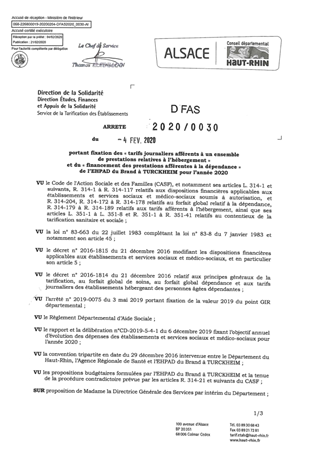 portant fixation des "tarifs journaliers afférents à un ensemble de prestations relatives à l'hébergement" et du "financement des prestations afférentes à la dépendance" de l'EHPAD du Brand à TURCKHEIM pour l'année 2020 Resumé Pièces jointes ARRETE Assemblée : Non défini Date : 04/02/2020 Rapporteur : Non défini Collectivité : Conseil départemental du Haut-Rhin Direction : Non défini Service : Direction Ressources Solidarité Domaine : Prix de Journée Commission :