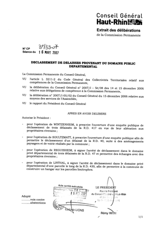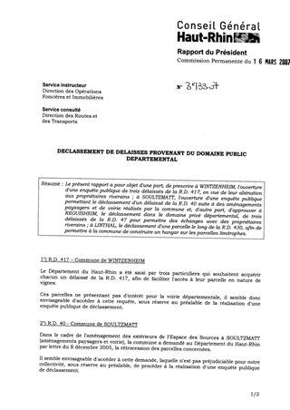 Le présent rapport a pour objet d'une part, de prescrire à WINTZENHEIM, l'ouverture d'une enquête publique de trois délaissés de la R.D. 417, en vue de leur aliénation aux propriétaires riverains ; à SOULTZMATT, l'ouverture d'une enquête publique permettant le déclassement d'un délaissé de la R.D. 40 suite à des aménagements paysagers et de voirie réalisés par la commune et, d'autre part, d'approuver à REGUISHEIM, le déclassement dans le domaine privé départemental, de trois délaissés de la R.D. 47 pour permettre des échanges avec des propriétaires riverains ; à LINTHAL, le déclassement d'une parcelle le long de la R.D. 430, afin de permettre à la commune de construire un hangar sur les parcelles limitrophes.