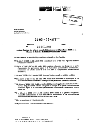 portant fixation des prix de journée hébergement et dépendance 2004 de la maison de retraite de BITSCHWILLER LES THANN. Resumé Pièces jointes ARRETE Assemblée : Non défini Date : 30/12/2003 Rapporteur : Non défini Collectivité : Conseil départemental du Haut-Rhin Direction : Non défini Service : Service de la Tarification des Etablissements Domaine : Prix de Journée Commission :
