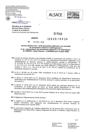 portant fixation des "tarifs journaliers afférents à un ensemble de prestations relatives à l'hébergement" et du "financement des prestations afférentes à la dépendance" de l'EHPAD "Saint-Vincent" à ODEREN pour l'année 2020 Resumé Pièces jointes ARRETE Assemblée : Non défini Date : 12/02/2020 Rapporteur : Non défini Collectivité : Conseil départemental du Haut-Rhin Direction : Non défini Service : Direction Ressources Solidarité Domaine : Prix de Journée Commission :