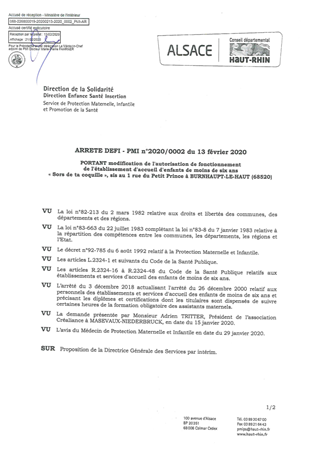 portant modification de l'autorisation de fonctionnement de l'établissement d'accueil d'enfants de moins de six ans "Sors de ta coquille", sis au 1 rue du Petit Prince à BURNHAUPT-LE-HAUT (68520) Resumé Pièces jointes ARRETE Assemblée : Non défini Date : 13/02/2020 Rapporteur : Non défini Collectivité : Conseil départemental du Haut-Rhin Direction : Non défini Service : Direction Enfance Famille Insertion Domaine : Accueil d'enfants Commission :