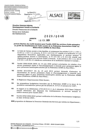 portant fixation des tarifs horaires pour l'année 2020 des services d'aide ménagère au profit des bénéficiaires de l'aide sociale de la Fédération Association d'Aide en Milieu Rural (ADMR) du Haut-Rhin Resumé Pièces jointes ARRETE Assemblée : Non défini Date : 18/02/2020 Rapporteur : Non défini Collectivité : Conseil départemental du Haut-Rhin Direction : Non défini Service : Direction Ressources Solidarité Domaine : Dotations financières Commission :