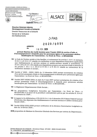 portant fixation des tarifs horaires pour l'année 2020 du service d'aide et d'accompagnement à domicile pour les personnes âgées et les personnes adultes handicapées de l'association "Le Droit de Vivre" à MULHOUSE Resumé Pièces jointes ARRETE Assemblée : Non défini Date : 18/02/2020 Rapporteur : Non défini Collectivité : Conseil départemental du Haut-Rhin Direction : Non défini Service : Direction Ressources Solidarité Domaine : Dotations financières Commission :
