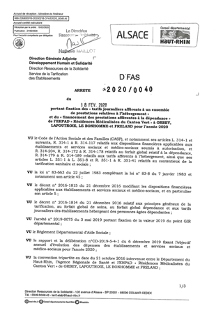 portant fixation des "tarifs journaliers afférents à un ensemble de prestations relatives à l'hébergement" et du "financement des prestations afférentes à la dépendance" de l'EHPAD "Résidences Médicalisées du Canton Vert" à ORBEY, LAPOUTROIE, LE BONHOMME