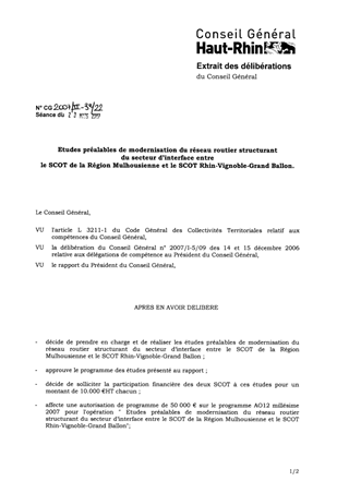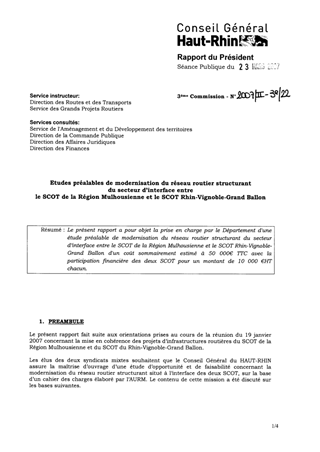 Le présent rapport a pour objet la prise en charge par le Département d'une étude préalable de modernisation du réseau routier structurant du secteur d’interface entre le SCOT de la Région Mulhousienne et le SCOT Rhin-Vignoble-Grand Ballon d'un coût sommairement estimé à 50 000€ TTC avec la participation financière des deux SCOT pour un montant de 10 000 €HT chacun.