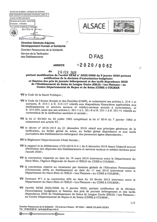 portant modification de l'arrêté DFAS n°2020-0006 du 9 janvier 2020 portant notification de la décision d'autorisation budgétaire et fixation des prix de journée hébergement et des tarifs dépendance 2020 de l'établissement de soins de longue durée (ESLD)