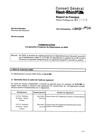 En 2006, le montant du capital garanti par le Département pour des prêts souscrits par 8 bénéficiaires s'élève à 15,12 M€. Le Département a acquitté 22,12 K€ au titre d'avances en garantie d'emprunt pour un organisme auquel il a accordé sa caution.