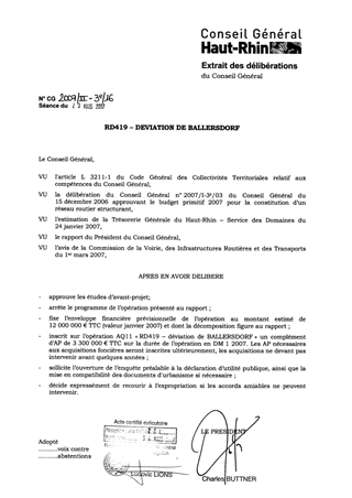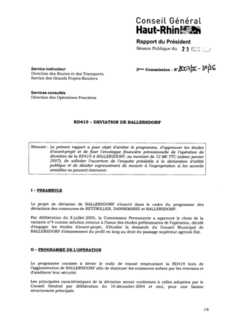 Le présent rapport a pour objet d’arrêter le programme, d’approuver les études d’avant-projet et de fixer l’enveloppe financière prévisionnelle de l’opération de déviation de la RD419 à BALLERSDORF, au montant de 12 M€ TTC (valeur janvier 2007), de solliciter l’ouverture de l’enquête préalable à la déclaration d’utilité publique et de décider expressément de recourir à l’expropriation si les accords amiables ne peuvent intervenir.