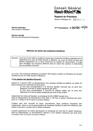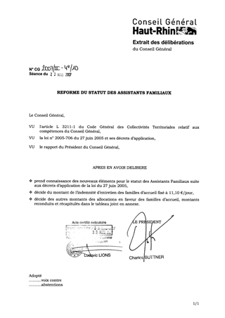 La loi du 27 juin 2005 a amélioré le statut des Assistants Familiaux employés par le Département au titre de l'Aide Sociale à l'Enfance. Au cours de 2006 ont paru les décrets d'application de ce texte notamment en matière de rémunération. Il s’agit donc d’intégrer ces nouveaux éléments dans le calcul des salaires et indemnités dûs aux familles d’accueil.