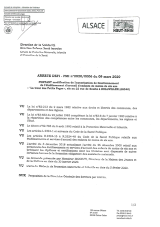 portant modification de l'autorisation de fonctionnement de l'établissement d'accueil d'enfants de moins de six ans "La Cour des Petits Pages", sis au 22 rue de Soultz à BOLLWILLER (68540) Resumé Pièces jointes ARRETE Assemblée : Non défini Date : 09/03/2020 Rapporteur : Non défini Collectivité : Conseil départemental du Haut-Rhin Direction : Non défini Service : Direction Enfance Famille Insertion Domaine : Accueil d'enfants Commission :