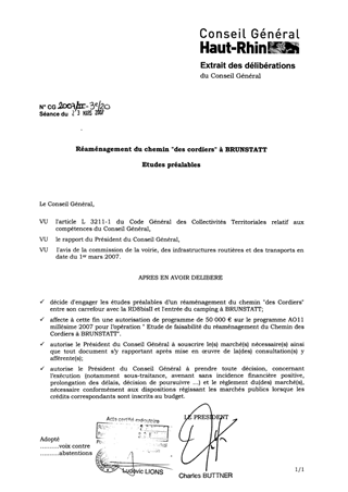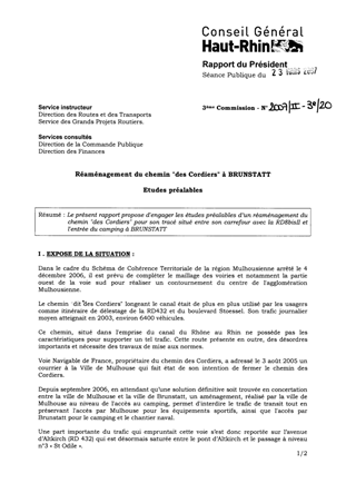 : Le présent rapport propose d'engager les études préalables d’un réaménagement du chemin "des Cordiers" pour son tracé situé entre son carrefour avec la RD8bisII et l'entrée du camping à BRUNSTATT