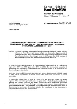 Le rapport propose d’approuver la convention avec l’ADEME pour l’année 2007 qui découle de l’accord-cadre pluriannuel adopté par l’Assemblée départementale le 28 septembre 2004, dans le but de promouvoir la réduction des déchets à la source, les collectes sélectives d’emballages et de bio déchets par les EPCI, ainsi que la sensibilisation du public et la promotion du compostage individuel.