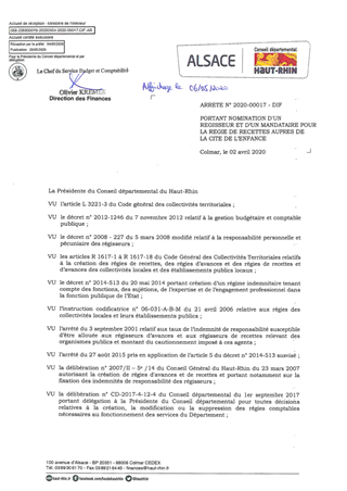 portant nomination d'un régisseur et d'un mandataire pour la régie de recettes auprès de la Cité de l'Enfance Resumé Pièces jointes ARRETE Assemblée : Non défini Date : 02/04/2020 Rapporteur : Non défini Collectivité : Conseil départemental du Haut-Rhin Direction : Non défini Service : Direction des Finances Domaine : Autres (non classés) Commission :