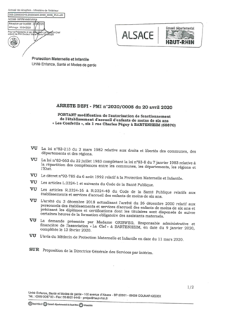 portant modification de l'autorisation de fonctionnement de l'établissement d'accueil d'enfants de moins de six ans « Les Confettis », sis 1 rue Charles Péguy à BARTENHEIM (68870) Resumé Pièces jointes ARRETE Assemblée : Non défini Date : 20/04/2020 Rapporteur : Non défini Collectivité : Conseil départemental du Haut-Rhin Direction : Non défini Service : Direction Enfance Famille Insertion Domaine : Accueil d'enfants Commission :