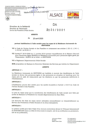 portant habilitation à l'aide sociale pour les repas de la Résidence Autonomie de SENTHEIM Resumé Pièces jointes ARRETE Assemblée : Non défini Date : 23/04/2020 Rapporteur : Non défini Collectivité : Conseil départemental du Haut-Rhin Direction : Non défini Service : Direction de l'Autonomie Domaine : Autres (non classés) Commission :