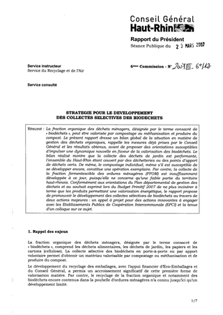 La fraction organique des déchets ménagers, désignée par le terme consacré de « biodéchets », peut être valorisée par compostage ou méthanisation et produire du compost. Le présent rapport dresse un bilan global de la situation en matière de gestion des déchets organiques, rappelle les mesures déjà prises par le Conseil Général et les résultats obtenus, avant de proposer des orientations susceptibles d’impulser une dynamique nouvelle en faveur de la valorisation des biodéchets. Le bilan réalisé montre que la collecte des déchets de jardin est performante, l’ensemble du Haut-Rhin étant couvert par des déchetteries ou des points d’apport de déchets verts. De même, le compostage individuel, même s’il est susceptible de se développer encore, constitue une opération exemplaire. Par contre, la collecte de la fraction fermentescible des ordures ménagères (FFOM) est insuffisamment développée à ce jour, puisqu’elle ne concerne qu’une faible partie du territoire haut rhinois. Conformément aux orientations du Plan départemental de gestion des déchets et au souhait exprimé lors du Budget Primitif 2007 de ne plus incinérer à terme que les produits permettant une valorisation énergétique, le rapport propose de promouvoir le développement des collectes sélectives de biodéchets au travers de deux actions majeures : un appel à projet pour des actions innovantes à engager avec les Etablissements Publics de Coopération Intercommunale (EPCI) et la tenue d’un colloque sur ce sujet.