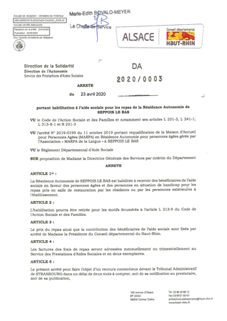 portant habilitation à l'aide sociale pour les repas de la Résidence d'Autonomie de SEPPOIS LE BAS Resumé Pièces jointes ARRETE Assemblée : Non défini Date : 23/04/2020 Rapporteur : Non défini Collectivité : Conseil départemental du Haut-Rhin Direction : Non défini Service : Direction de l'Autonomie Domaine : Autres (non classés) Commission :