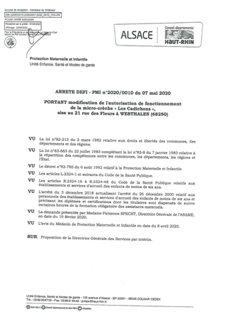 portant modification de l'autorisation de fonctionnement de la micro-crèche "Les Cadichons", sise au 21 rue des Fleurs à WESTHALTEN (68250) Resumé Pièces jointes ARRETE Assemblée : Non défini Date : 07/05/2020 Rapporteur : Non défini Collectivité : Conseil départemental du Haut-Rhin Direction : Non défini Service : Direction Enfance Famille Insertion Domaine : Accueil d'enfants Commission :