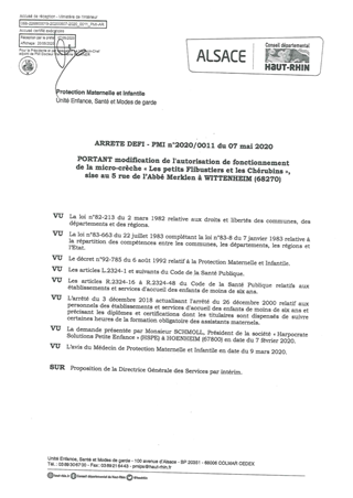 portant modification de l'autorisation de fonctionnement de la micro-crèche "Les Petits Flibustiers et les Chérubins", sise au 5 rue de l'Abbé Merklen à WITTENHEIM (68270) Resumé Pièces jointes ARRETE Assemblée : Non défini Date : 07/05/2020 Rapporteur : Non défini Collectivité : Conseil départemental du Haut-Rhin Direction : Non défini Service : Direction Enfance Famille Insertion Domaine : Accueil d'enfants Commission :