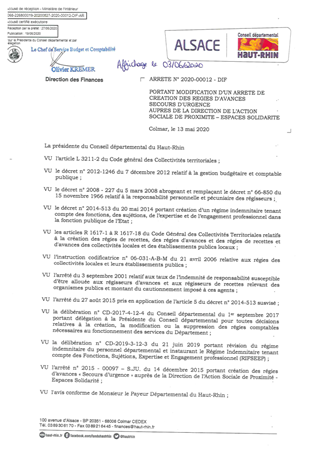 portant modification d'un arrêté de création des régies d'avances secours d'urgence auprès de la Direction de l'Action Sociale de Proximité - Espaces solidarité Resumé Pièces jointes ARRETE Assemblée : Non défini Date : 13/05/2020 Rapporteur : Non défini Collectivité : Conseil départemental du Haut-Rhin Direction : Non défini Service : Direction des Finances Domaine : Autres (non classés) Commission :