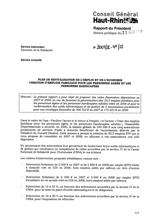Plan de revitalisation économique et de l'emploi - création d'emplois familiaux pour les personnes âgées et les personnes handicapées. Subvention au titre des années 2007 et 2008