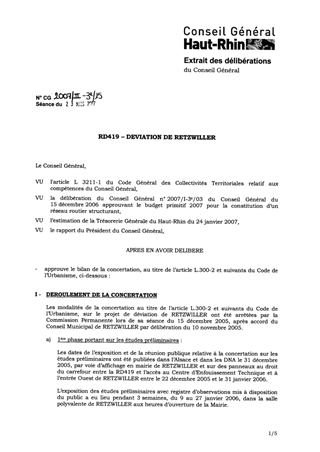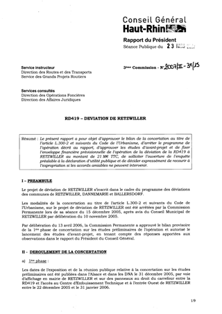 Le présent rapport a pour objet d’approuver le bilan de la concertation au titre de l’article L.300-2 et suivants du Code de l’Urbanisme, d’arrêter le programme de l’opération décrit au rapport, d’approuver les études d’avant-projet et de fixer l’enveloppe financière prévisionnelle de l’opération de la déviation de la RD419 à RETZWILLER au montant de 21 M€ TTC, de solliciter l’ouverture de l’enquête préalable à la déclaration d’utilité publique et de décider expressément de recourir à l’expropriation si les accords amiables ne peuvent intervenir.